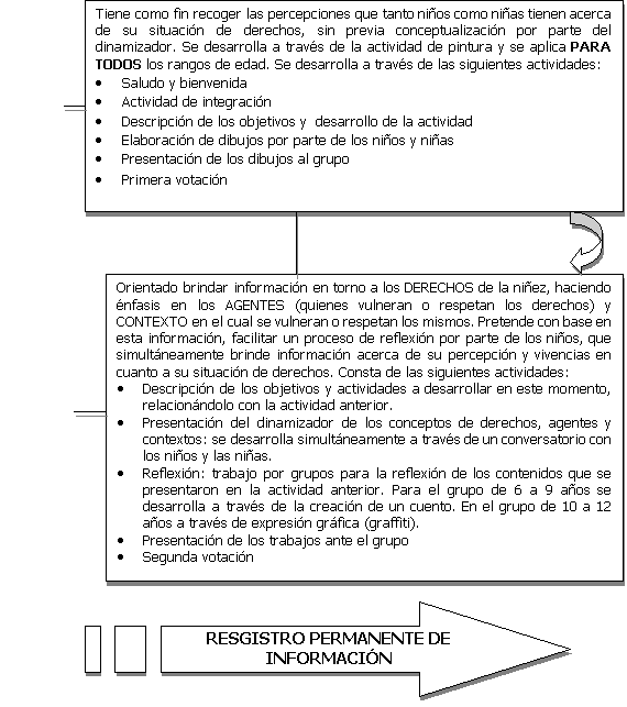 � INFORMACION: con base en lo anterior brinde informaci�n a los ni�os y ni�as acerca del� concepto, significado y sentido de los derechos, agentes y contextos en donde son vulnerados o respetados, articulando la conversaci�n al contenido expuesto en las pinturas y a las vivencias de los participantes, es importante apoyar este momento con ayudas did�cticas sobre el tema, tales como fotograf�as, dibujos, acetatos, entre otros. Promueva la participaci�n del grupo a trav�s de preguntas o ejemplos, de tal manera que la din�mica que tome la actividad sea tipo conversatorio y pueda aclarar los conceptos en cada uno de los derechos sobre los cuales se har� la votaci�n.