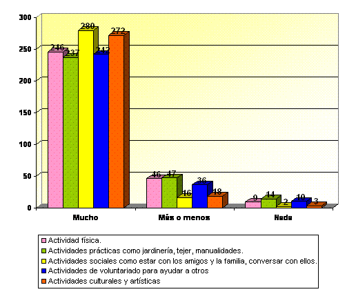Esta informaci�n se ampl�a con la encuesta desarrollada con 331 adultos mayores en el programa Nuevo Comienzo: Otro Motivo para Vivir en el a�o 2005, (Anexo 2), donde se observa la misma tendencia de las preguntas anteriores: Compartir, dialogar, conversar, estar con amigos, familiares, vecinos, compa�eros, jugar, actividades de voluntariado, actividades religiosas manualidades y art�sticas, entre otras. En general no se observa una diferencia marcada entre los departamentos, salvo en aquellos donde se desarrollan actividades como la caza y la pesca, las cuales son consideradas recreativas por los participantes.