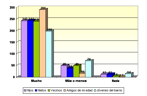 Otra categor�a indagaba sobre las preferencias en relaci�n con las personas con las que prefieren realizar las actividades recreativas. Los resultados muestran una mayor frecuencia para amigos, seguido de hijos, nietos y vecinos, y en menor cantidad fueron elegidos los j�venes, aunque la frecuencia representa a m�s de un 50% del total de encuestados.