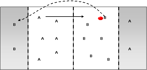 Las l�neas punteadas indican las divisiones que se deben hacer en el espacio, las A y las B corresponden a los integrantes de cada equipo, se identifican igualmente la pelota y los desplazamientos, con la flecha en l�nea recta el recorrido de la pelota y con la curva punteada el desplazamiento del jugador que ha sido ponchado. As�, las indicaciones son: