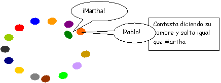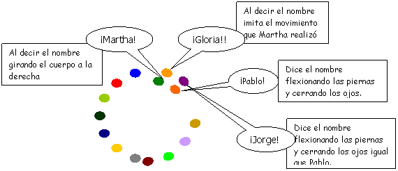 Ubicados de pie formando un c�rculo el dinamizador inicia su presentaci�n personal diciendo su nombre al participante que se encuentra al lado derecho, al pronunciarlo debe acompa�arlo con un movimiento corporal, quien lo escucha debe repetir su nombre imitando el movimiento corporal del dinamizador, luego �ste participante pasa al frente� de su compa�ero de la� derecha y dice su nombre con otro movimiento corporal y �ste le imita diciendo su propio nombre, la idea es que cada uno pasa frente a todos sus compa�eros diciendo su nombre pero cambiando la expresi�n corporal que presenta a cada uno hasta que el �ltimo pase igualmente por todos, as� el c�rculo se desarma y arma finalmente. El recorrido se ver�a as�: