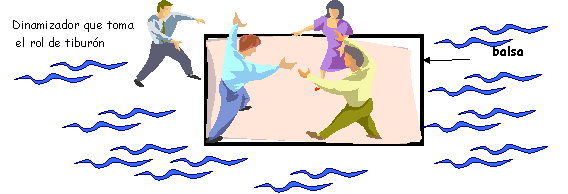 El dinamizador dibuja un rect�ngulo en el suelo de 2 mts x 4 mts,� la zona dentro del rect�ngulo es la balsa y la que queda afuera ser� el mar. Todos los participantes se ubicar�n dentro de este rect�ngulo, y en la zona del mar podr� desplazarse �nicamente el dinamizador quien har� las veces de tibur�n., el objetivo del juego es que quede una sola persona dentro de la balsa, de tal manera que si algunos participantes durante la intenci�n de sacar a los dem�s, saca del rect�ngulo alguna parte del cuerpo como un pie, una pierna, un brazo,� la cadera , etc.,� puede ser cogido por el tibur�n, en este caso la persona sale de la balsa y pasa a la zona de mar convirti�ndose en un nuevo tibur�n, as�, a medida que vayan saliendo de la balsa, el n�mero de tiburones aumentar�, hasta que quede una sola persona dentro de la balsa, al finalizar el juego pueden reiniciarlo o realizar otra actividad.