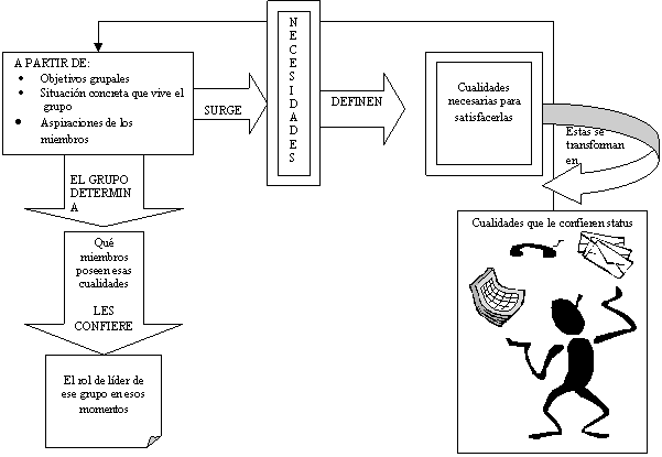 El l�der emerge en el grupo debido a que sus cualidades personales le confieren una eficacia social y lo hacen ser aceptado como un medio adecuado para el crecimiento grupal.� La funci�n primordial del l�der es contribuir al progreso del grupo en la direcci�n que �ste lo requiera; para lograr esto, �l debe asumir los objetivos, sentimientos, expectativas del grupo, y expresarlos adecuadamente, de tal forma que su actitud en un momento determinado sea una manifestaci�n de las fuerzas presentes en el grupo.
