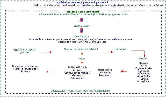 En consecuencia, desde el inicio del proyecto de una Ludoteca se debe tener claro el compromiso que cada una de ellas en cuanto instituci�n que es, debe tener formulado su propio Plan de Desarrollo, �nico mecanismo que permite establecer un derrotero y un marco de actuaci�n con una intencionalidad, m�nimo ejercicio de responsabilidad social cuando se enfrenta una situaci�n de recursos escasos �que hacen que generar una Ludoteca sea casi un lujo para una comunidad-� y se entra en un juego de generaci�n de expectativas para una comunidad �que debe tener claro si lo que recibe es un �regalo� del que se va a beneficiar o si va a ser un espacio de gesti�n comunitaria-. �