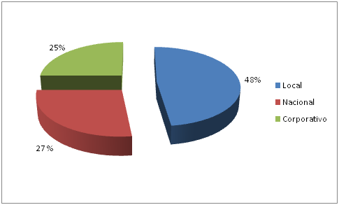 Gráfica No. 1: Porcentaje de contratación en los ámbitos local (Municipios/departamentos), nacional y corporativo - empresas.