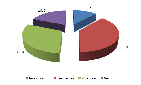 Como se puede observar los mayores porcentajes se acumulan en las áreas de formación y de vivencias, con un menor porcentaje en investigación debido a que este tipo de procesos usualmente no son financiados sino que se desarrollan paralelos a las actividades de proyectos contratados con otros propósitos.