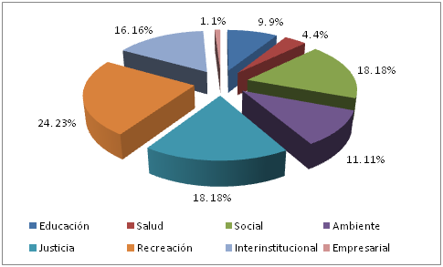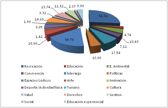 Coherente con el enfoque multidisciplinario que ha construido la fundación a lo largo de los años, y el reconocimiento de una amplia gama de beneficios psicológicos, sociales, comunitarios, ambientales y económicos de la recreación, la fundación ha trabajado una multiplicidad de temas, que justamente han sido el semillero para la construcción de su enfoque y sustenta su capacidad de trabajo intersectorial como se observa en la gráfica No. 4.